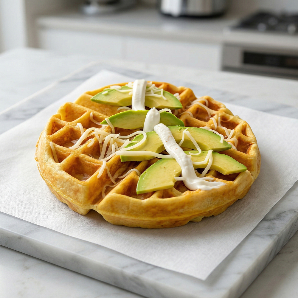 High-protein savory waffle topped with avocado, mozzarella, and sour cream — simple, satisfying, and full of smart fuel.